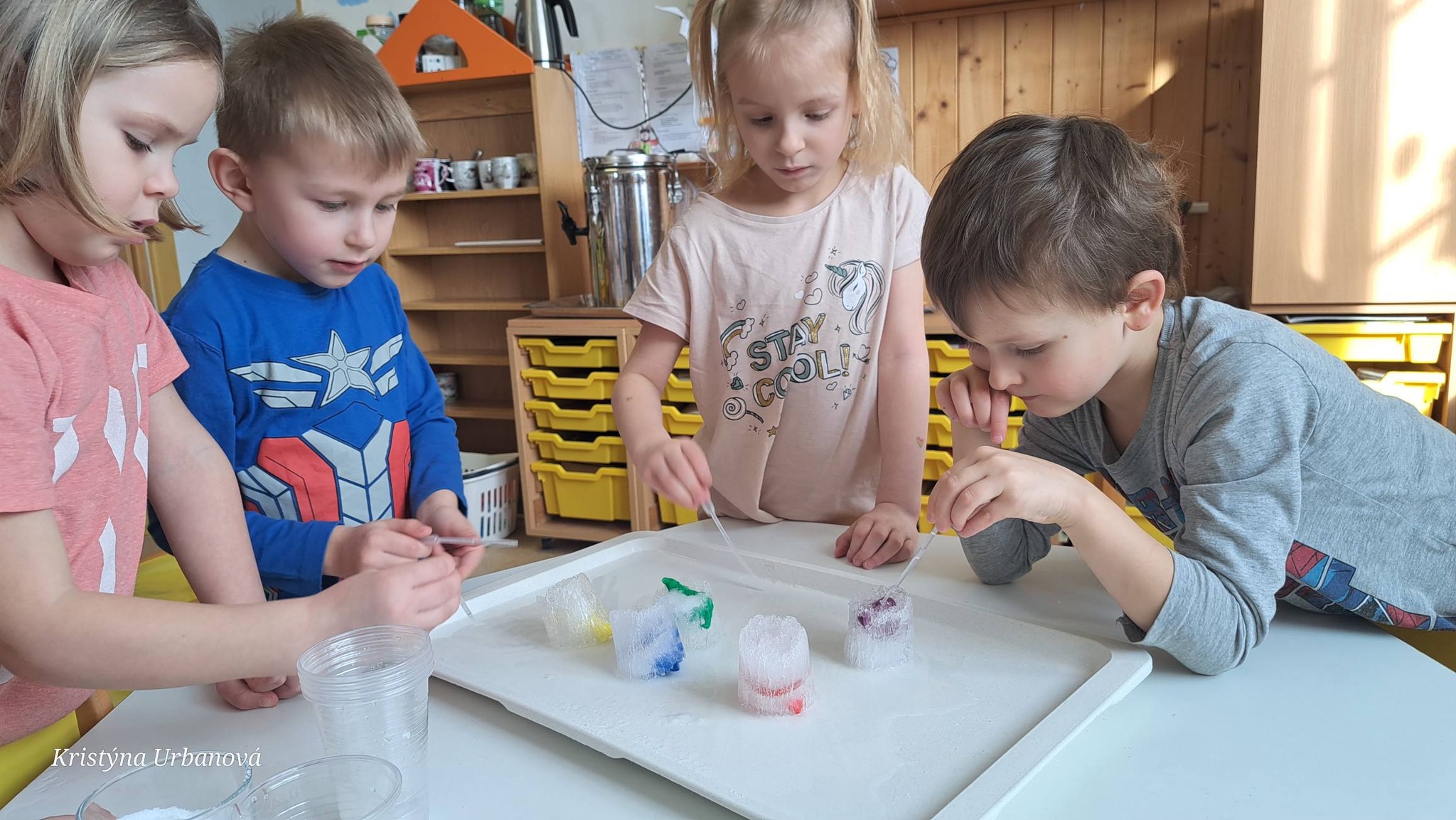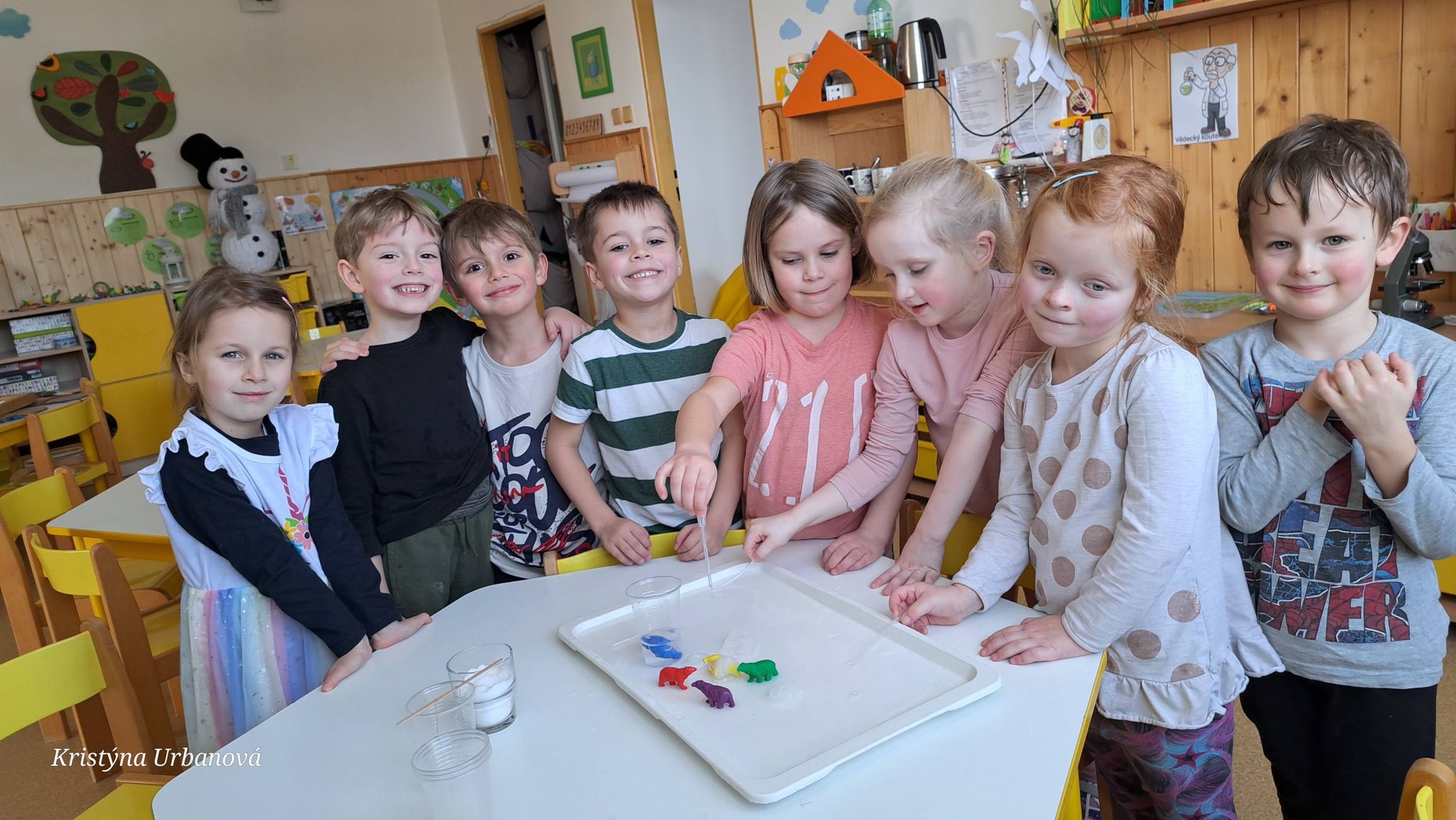 Výsledkem bylo nadšení, radost z objevování a praktické porozumění tomu, že led reaguje na teplo i sůl, a že přírodní jevy mají své zákonitosti. Tento typ badatelské činnosti přirozeně rozvíjí schopnost dětí objevovat svět kolem sebe, podporuje jejich samostatnost a spolupráci.