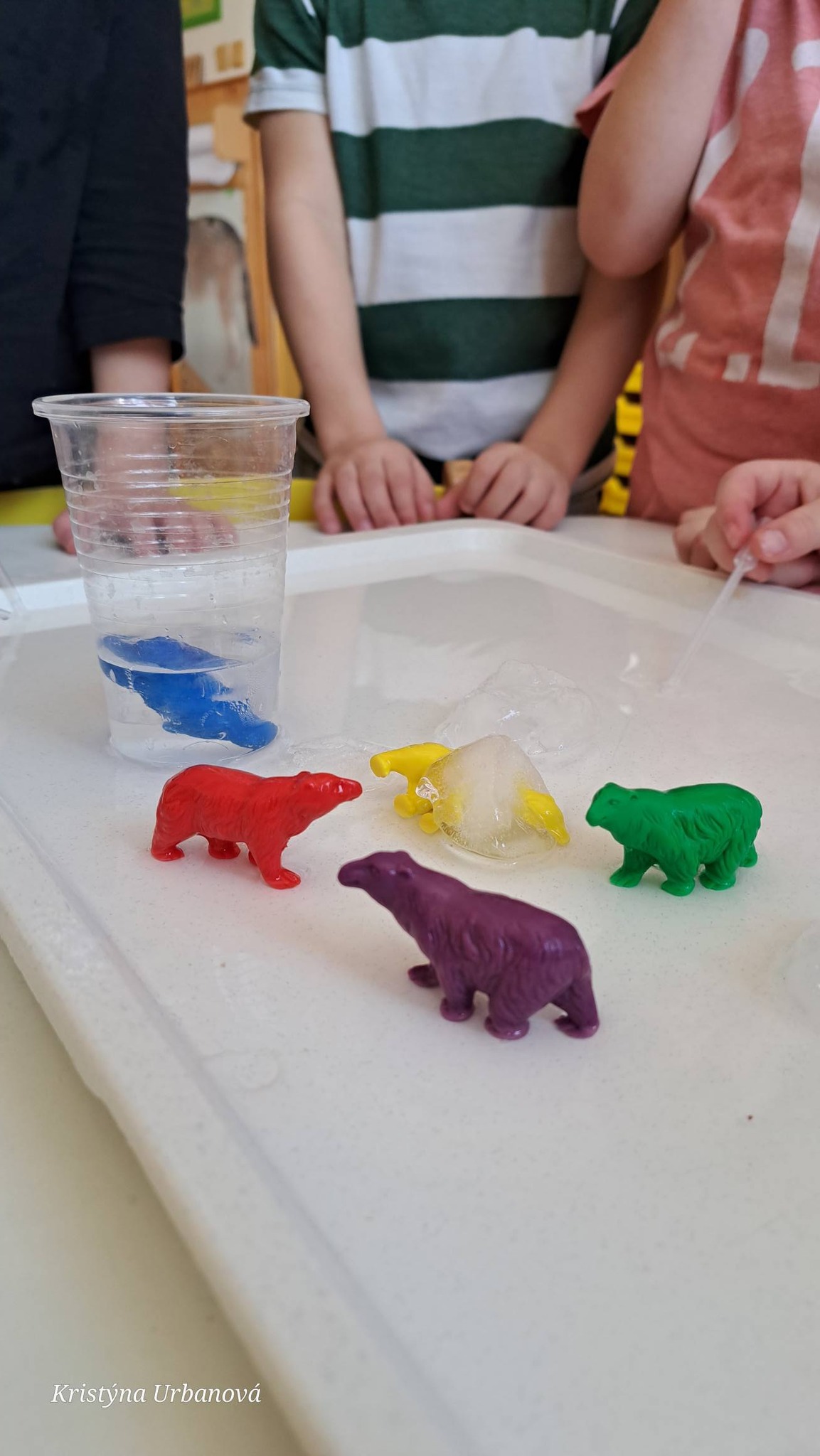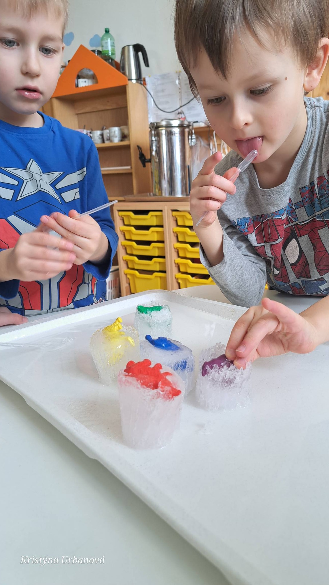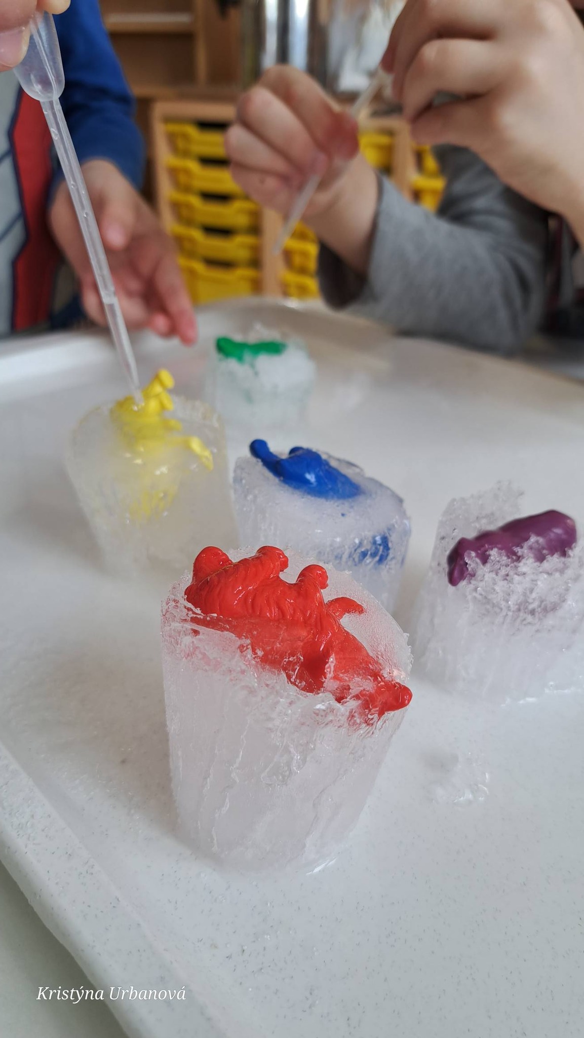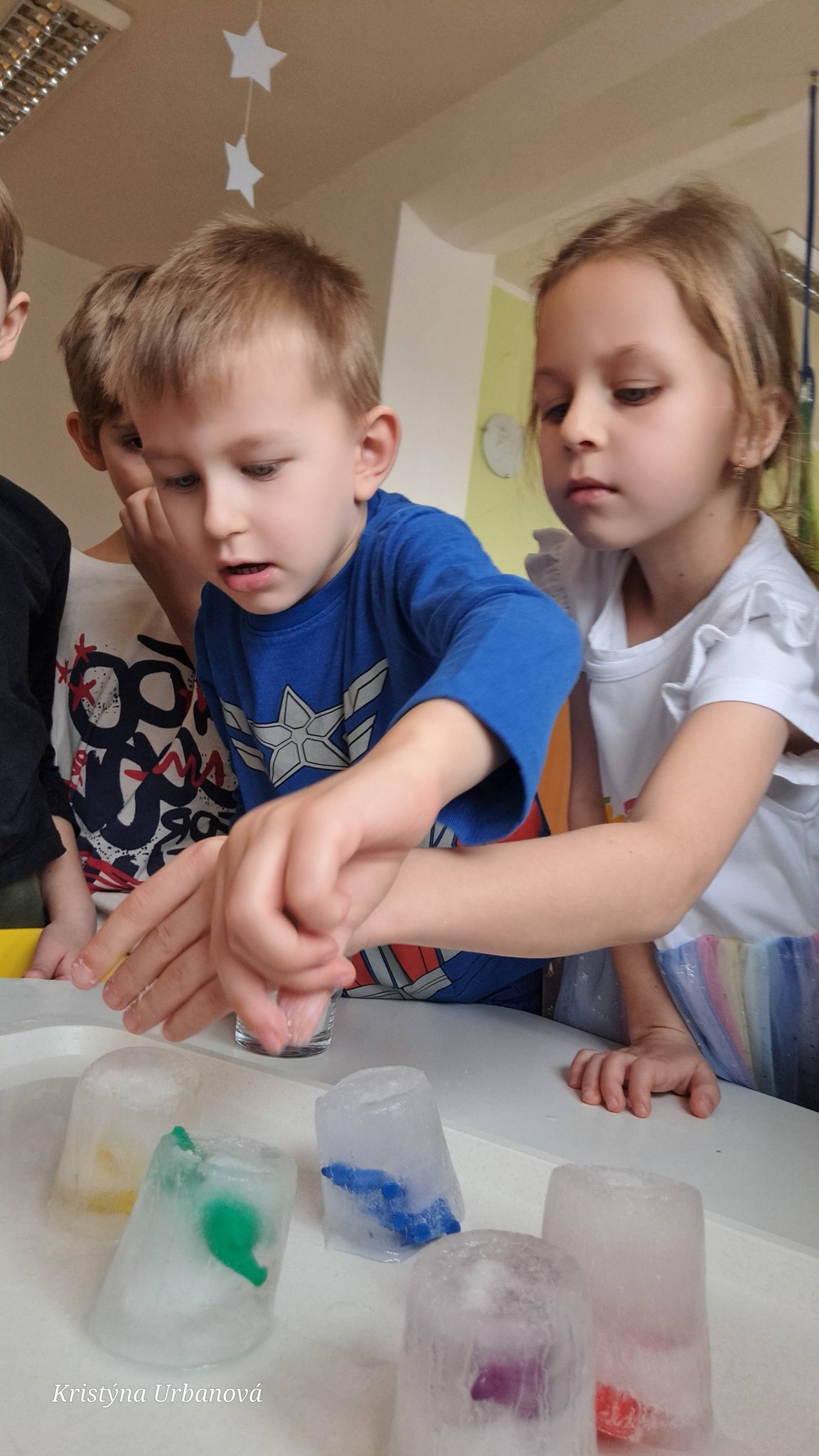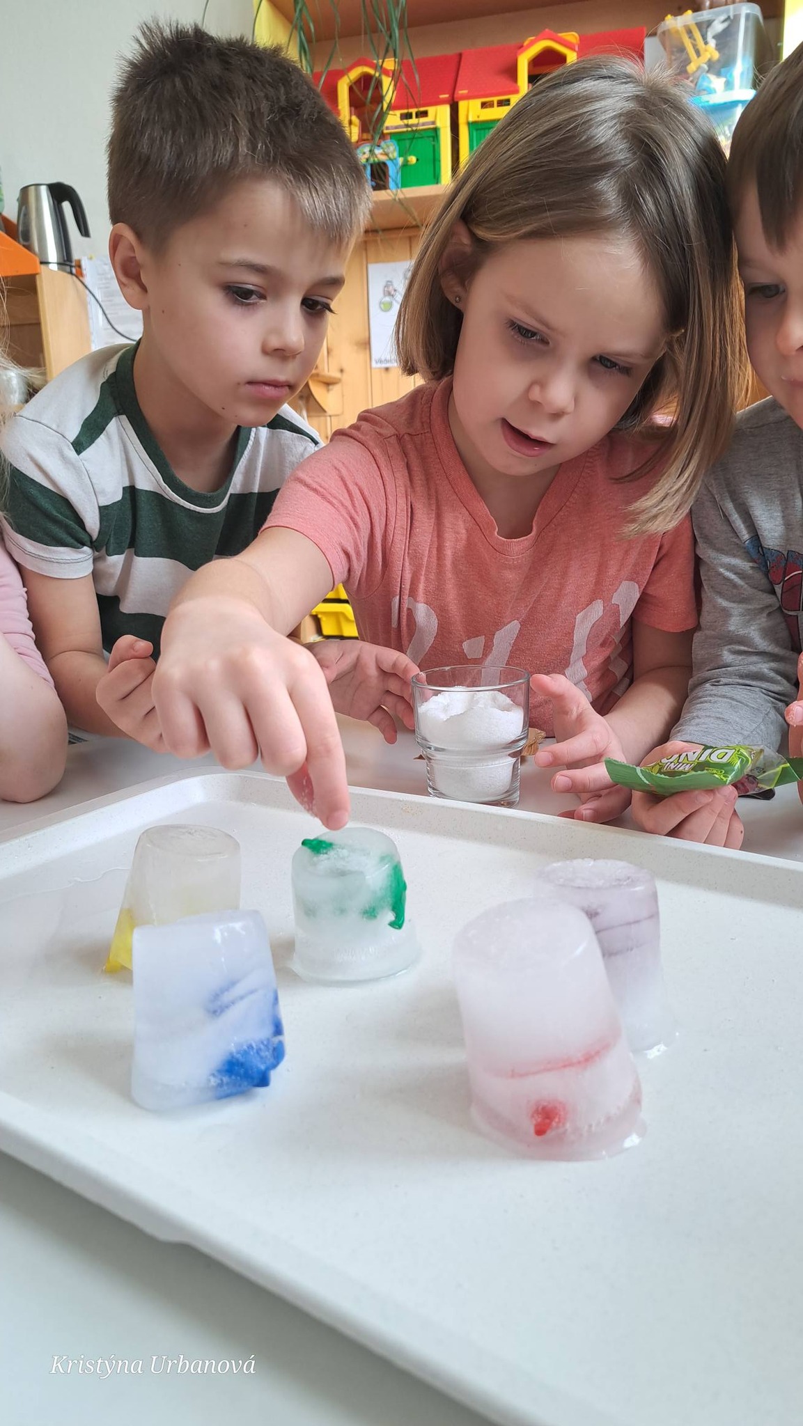 Dalším pokusem bylo zamrazení plastových zvířátek v kostkách ledu. Děti měly za úkol přijít na způsoby, jak zvířátka osvobodit. Zkoumaly účinek teplé vody, posypání solí, mechanického rozbíjení a čekání při pokojové teplotě. Při pokusech samy odhadovaly, která metoda bude nejrychlejší, a porovnávaly výsledky. Učitelka děti jemně nasměrovala otázkami typu: „Co myslíš, že se stane, když použijeme teplou vodu?“ nebo „Proč led měkne, když ho posypeme solí?“, čímž podporovala jejich logické myšlení a schopnost formulovat hypotézy.