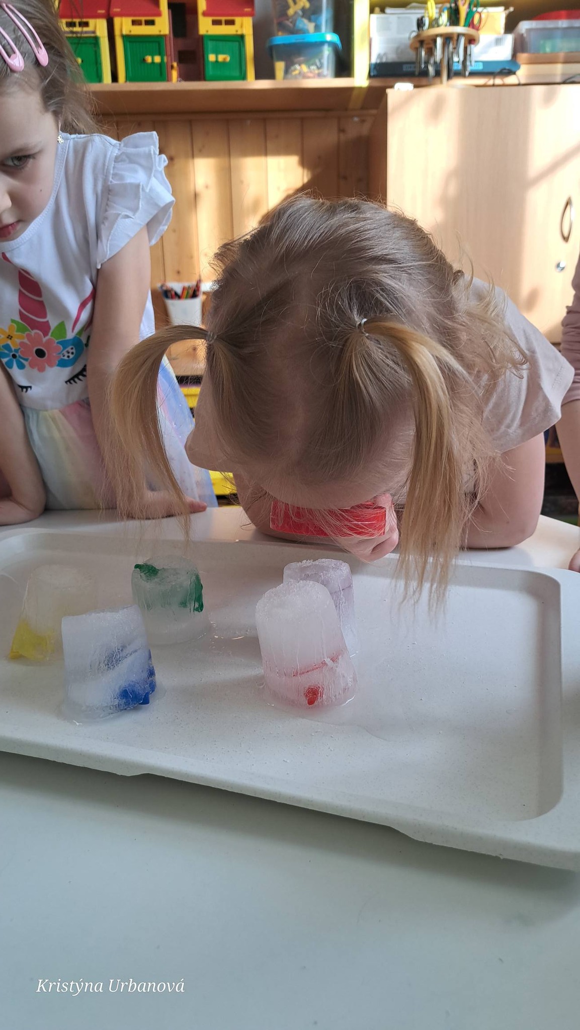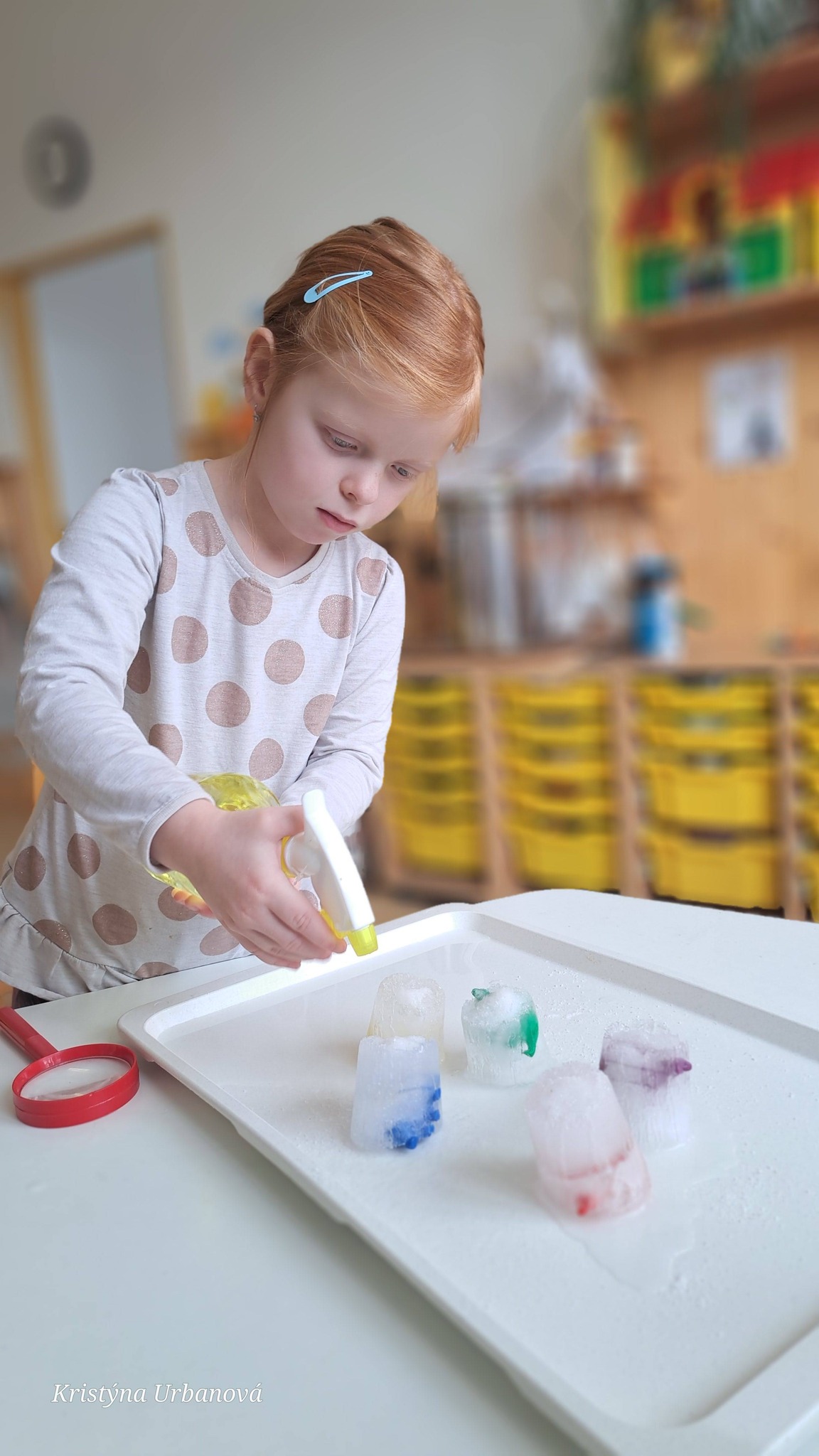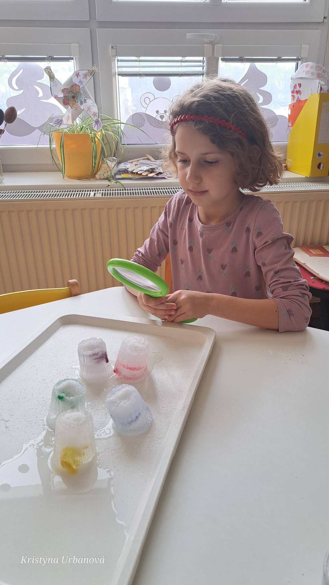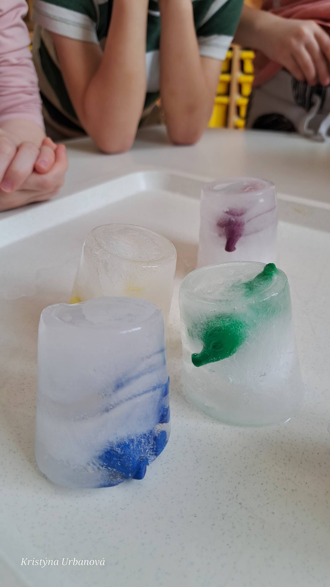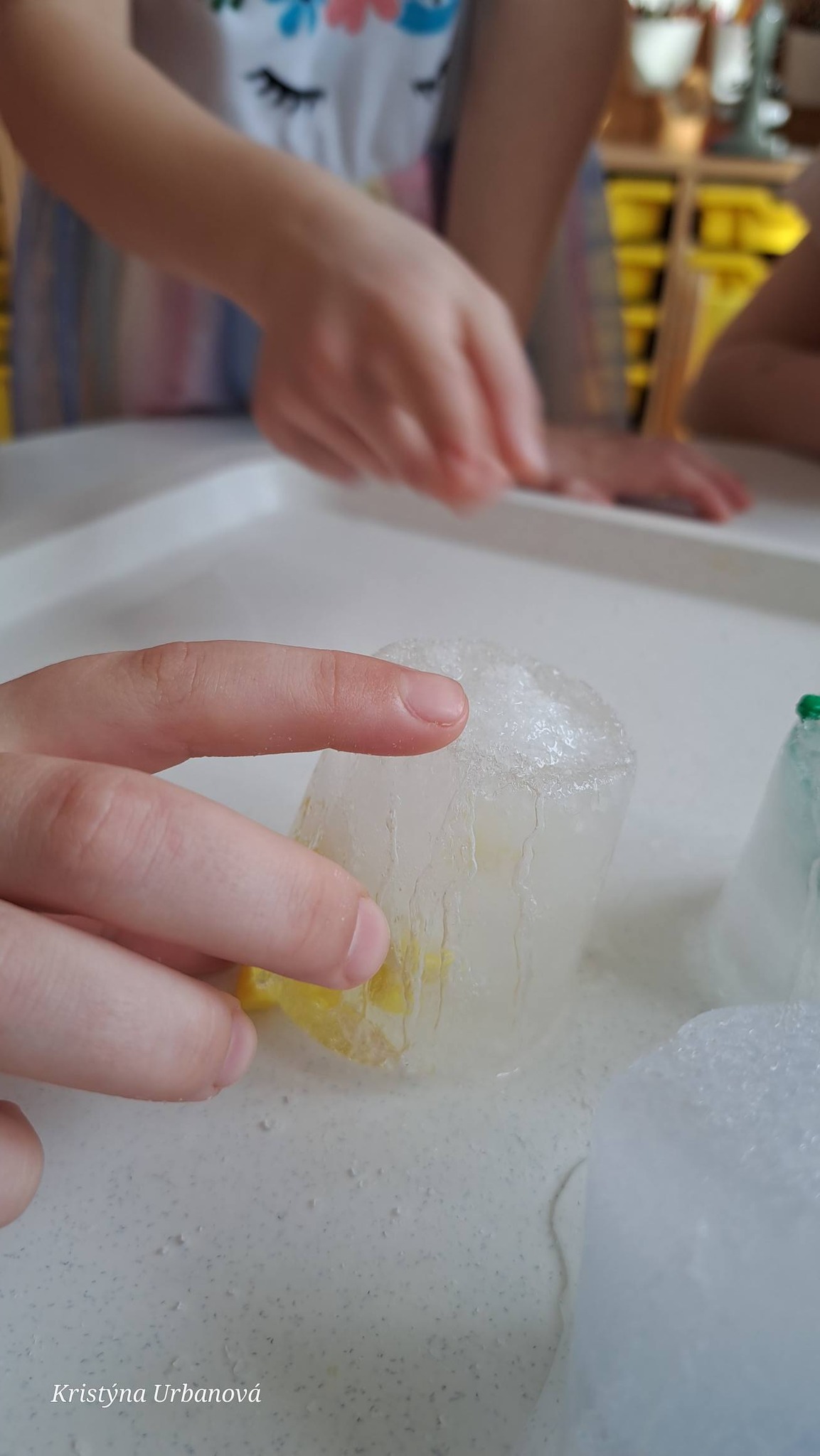 Dalším pokusem bylo zamrazení plastových zvířátek v kostkách ledu. Děti měly za úkol přijít na způsoby, jak zvířátka osvobodit. Zkoumaly účinek teplé vody, posypání solí, mechanického rozbíjení a čekání při pokojové teplotě. Při pokusech samy odhadovaly, která metoda bude nejrychlejší, a porovnávaly výsledky. Učitelka děti jemně nasměrovala otázkami typu: „Co myslíš, že se stane, když použijeme teplou vodu?“ nebo „Proč led měkne, když ho posypeme solí?“, čímž podporovala jejich logické myšlení a schopnost formulovat hypotézy.