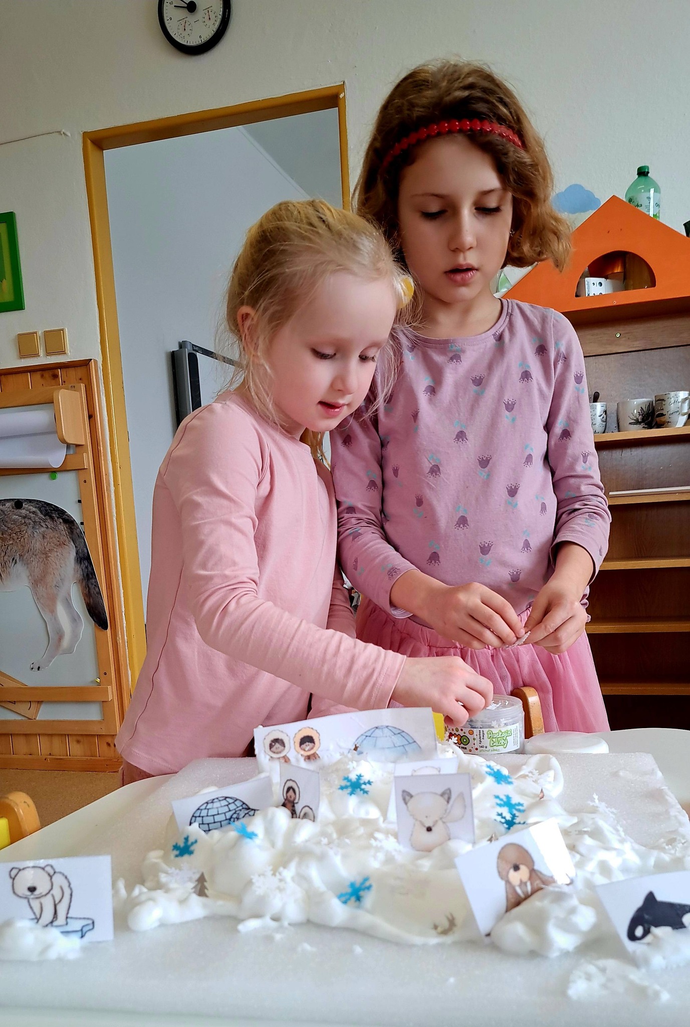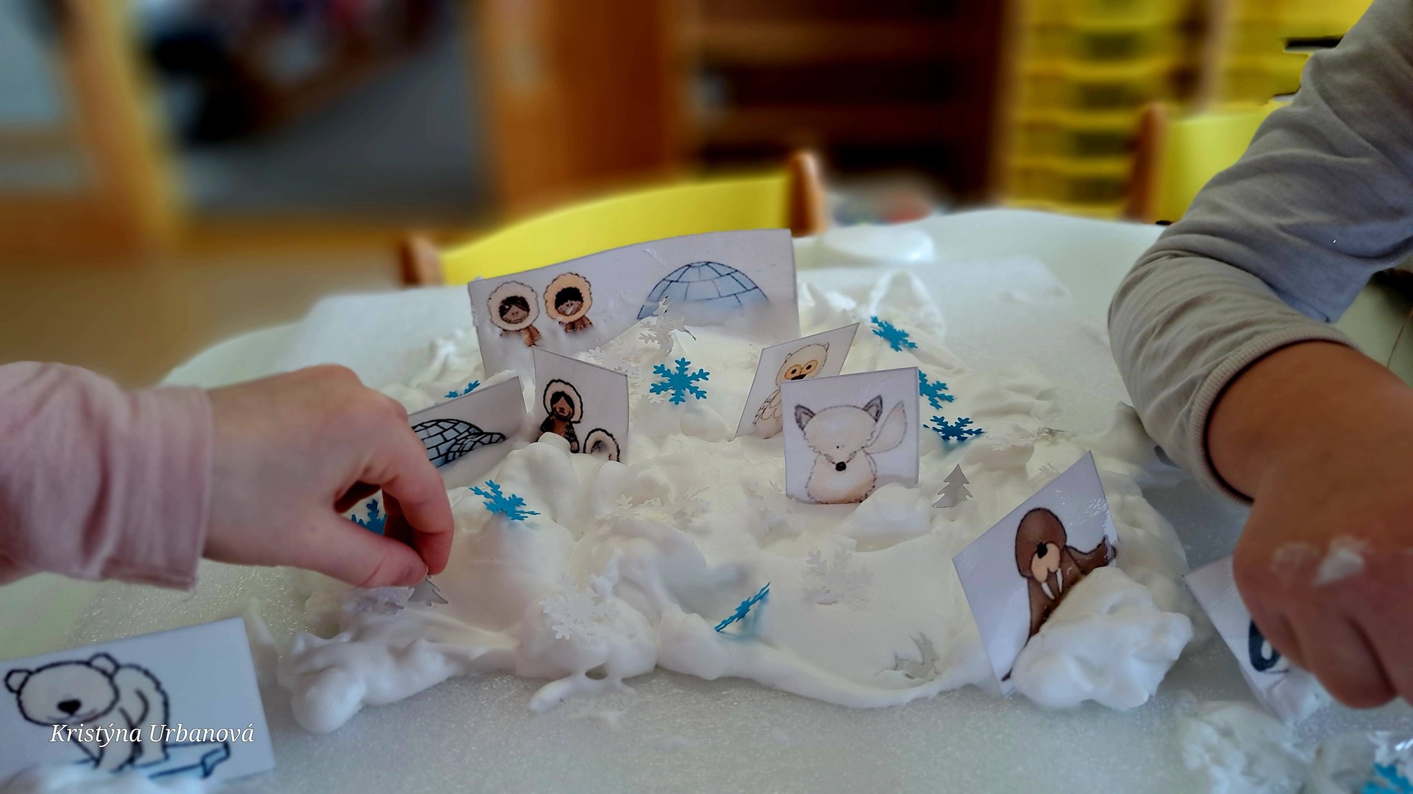 V rámci tematického bloku „Severní pól“ jsme se věnovali badatelským aktivitám, které dětem umožnily samostatně objevovat vlastnosti ledu a experimentovat s jeho změnami.Nejprve děti pracovaly s pěnou na holení, kterou jsme použili jako model ledových ker. Pěnu zkoumaly rukama, zkoušely, jak drží tvar, jak se mění při tlaku, foukání nebo zahřátí. Experimenty probíhaly formou pozorování, porovnávání a diskuse ve dvojicích a malých skupinkách, kdy děti vyjadřovaly své postřehy a sdílely, co jim připomíná. Tento postup podporoval jejich aktivní zapojení a schopnost formulovat vlastní závěry.