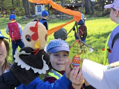 Krásný sluníčkový den jsme ve školce využili a děteme jsme připravili velikonční dopolední akci. Děti hledaly po cestě na Boží horu zatoulaná vajíčka slepičky Evelíny, plnily velikonoční úkoly. Za nalezená vajíčka, dětem slepička Evelína schovala poklad, který děti hledaly. A co se v pokladu skrývalo? No přece vajíčka, ale nebojte, tentokrát to byla vajíčka čokoládová..... Na závěr na děti čekala zmrzlina :)