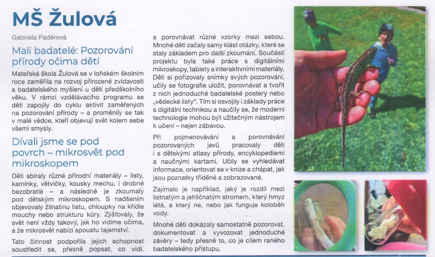 Mateřská škola Žulová sice patří k menším školkám, ale její práce má daleký dosah. Jsme hrdí, že jsme se stali součástí článku v časopise Mensa Česko, který si všímá inspirativních přístupů ve vzdělávání.
