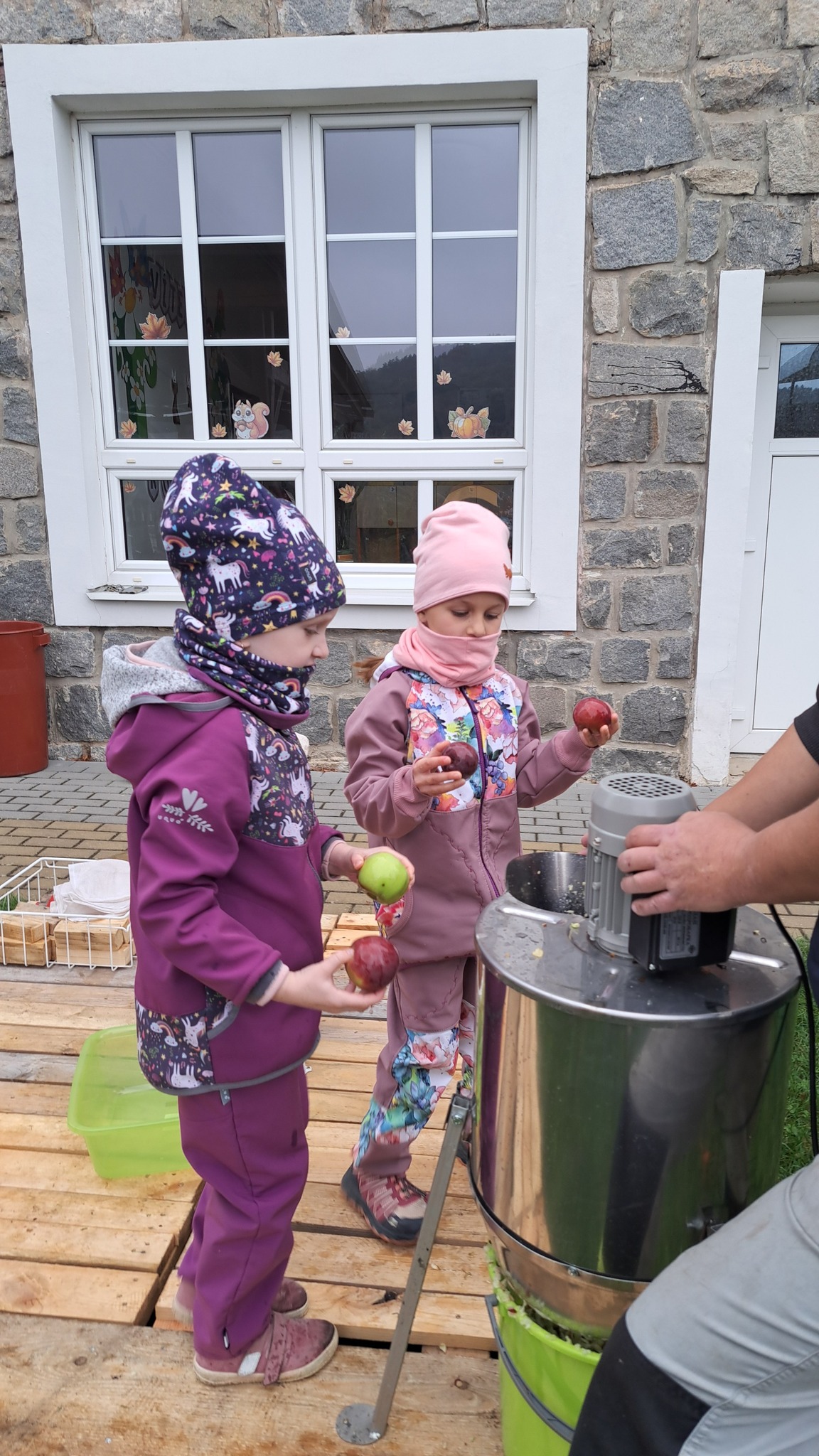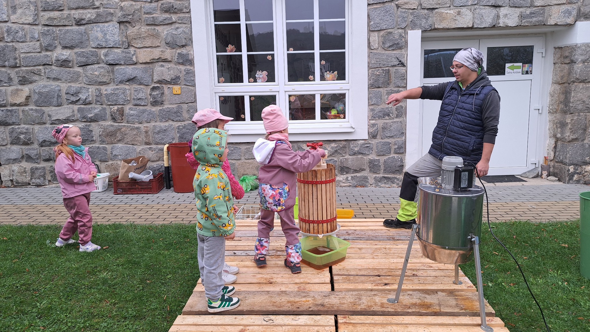 Spolupráce s rodiči je nedílnou součástí života v mateřské škole a přináší dětem mnoho cenných zážitků. Tentokrát jsme ve školce přivítali pana Roubala, který dětem poutavě představil proces moštování. Seznámil je s přípravou jablek, samotným lisováním, výrobou moštu i jeho uskladněním.