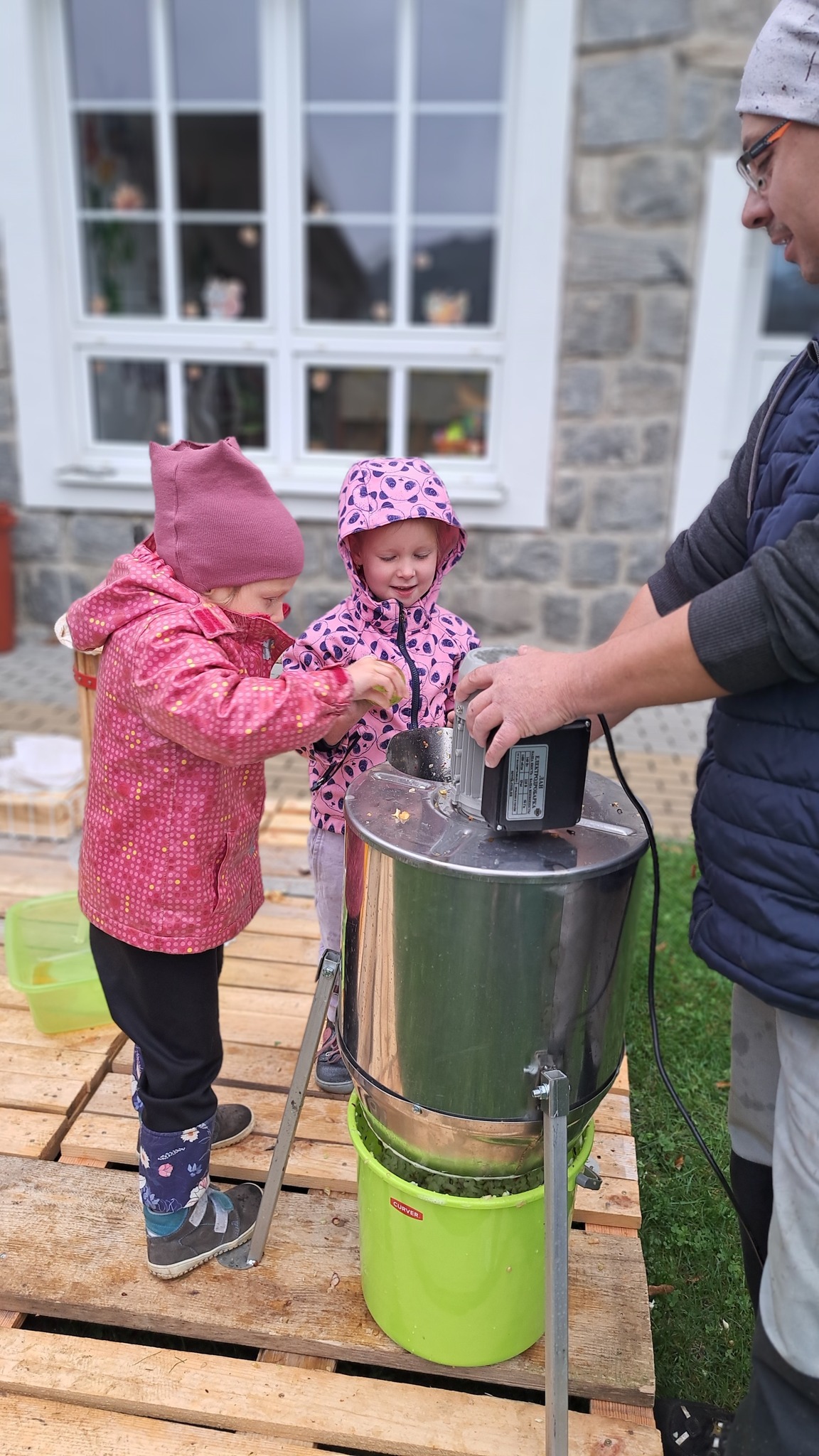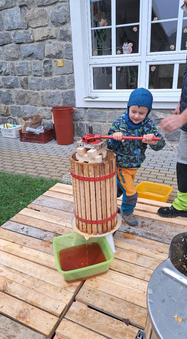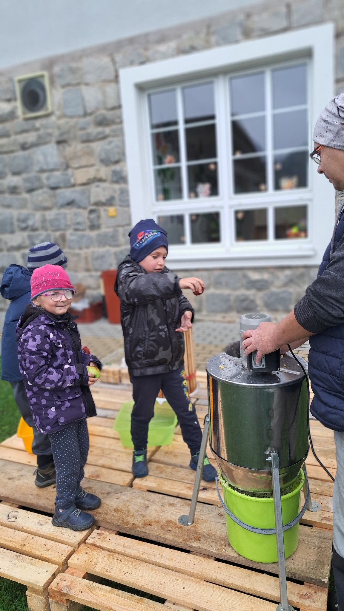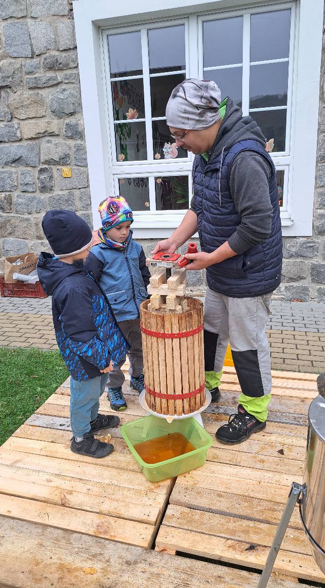 Děti si celý proces nejen prohlédly, ale také se aktivně zapojily – jablka omývaly, přenášely a společně sledovaly, jak se mění ve voňavou jablečnou šťávu. Výsledkem jejich snažení byl výborný, čerstvý mošt, který si všichni s chutí vychutnali.