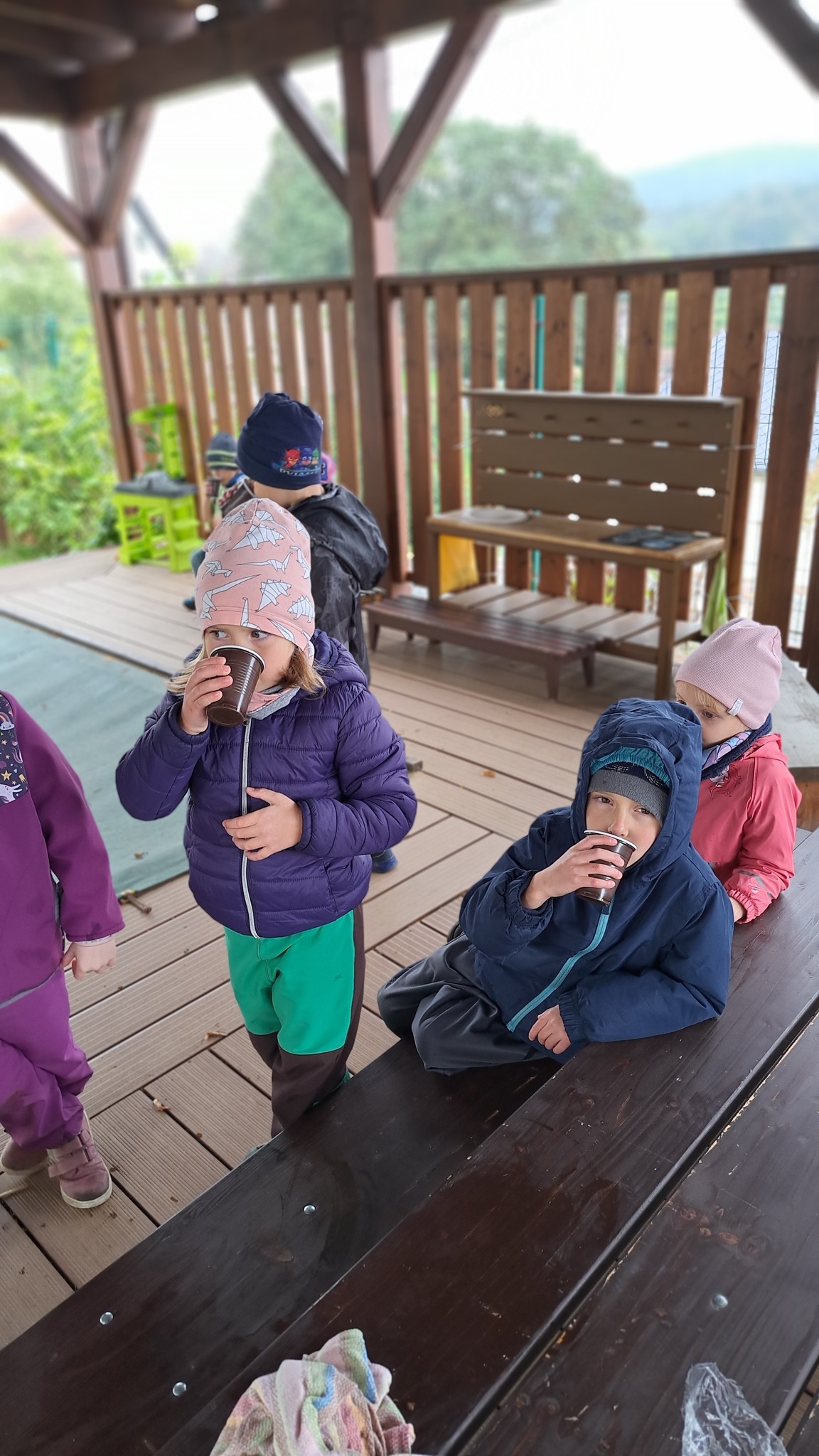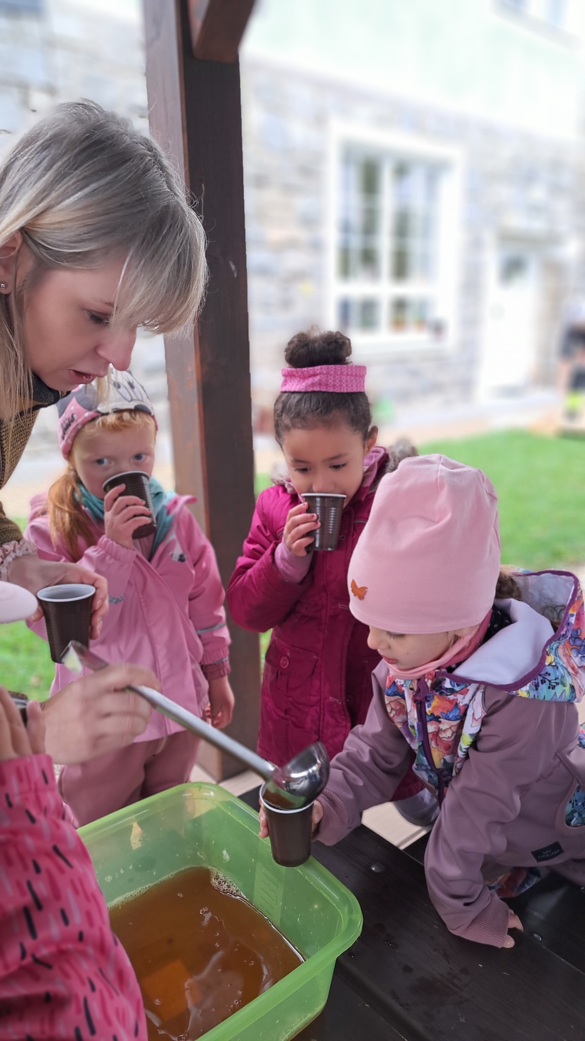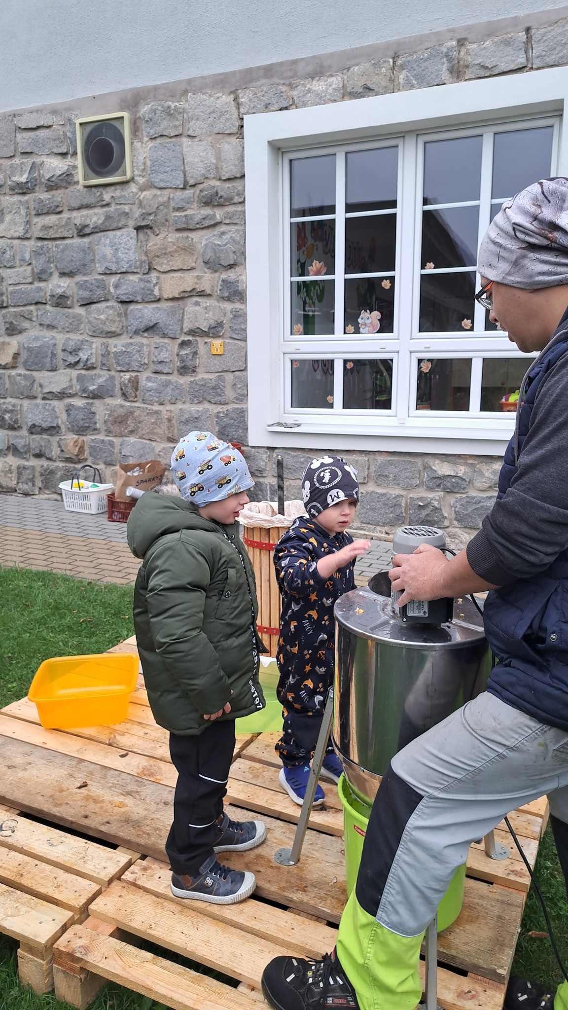 Děti si celý proces nejen prohlédly, ale také se aktivně zapojily – jablka omývaly, přenášely a společně sledovaly, jak se mění ve voňavou jablečnou šťávu. Výsledkem jejich snažení byl výborný, čerstvý mošt, který si všichni s chutí vychutnali.