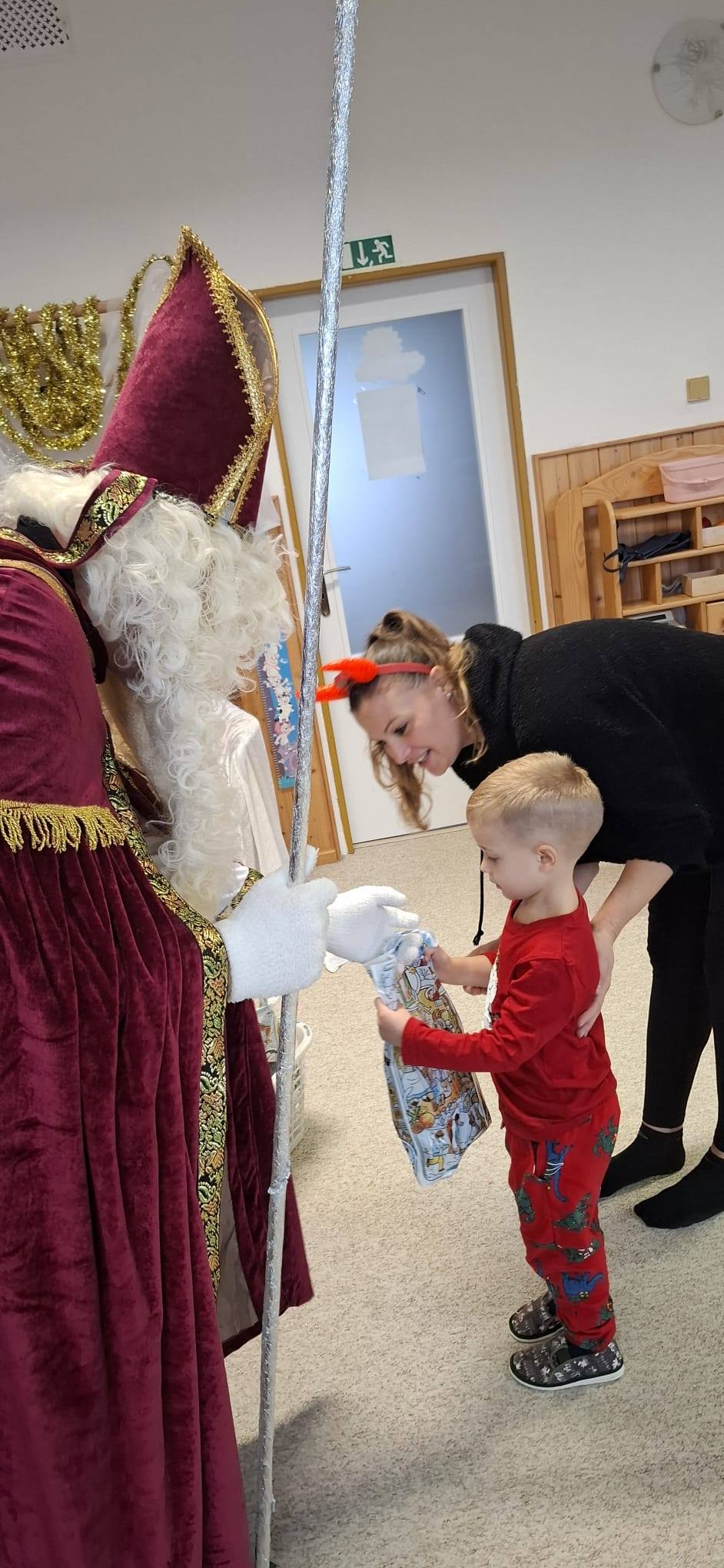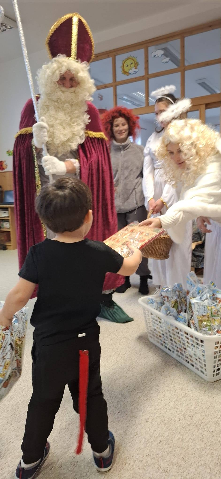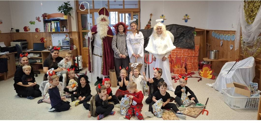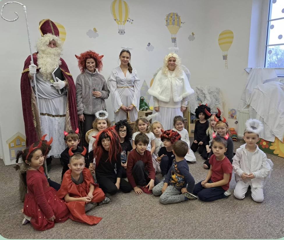 V pátek 5.12.2025 k nám do školky zavítal Mikuláš se svou družinou a přinesl dětem spoustu radosti. Andělé rozdávali úsměvy a pochvaly, čert zase trochu zařinčel řetězem – jen tolik, aby to bylo dobrodružné, ale ne strašidelné.Děti si připravily básničky, písničky a zatancovaly. Děti dostaly balíček s dobrotami, dárky od Mikuláše, Anděla a čerta, které věnovali klienti z Výchovného ústavu a školní jídelny Žulová. Tímto jim moc děkujeme za spolupráci.