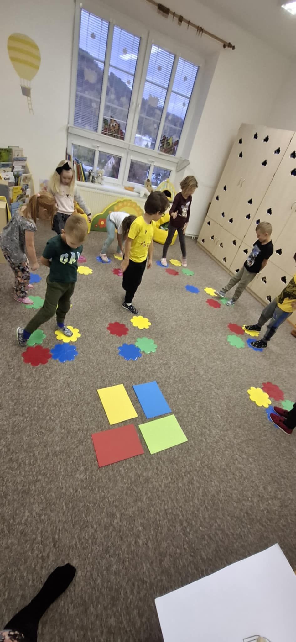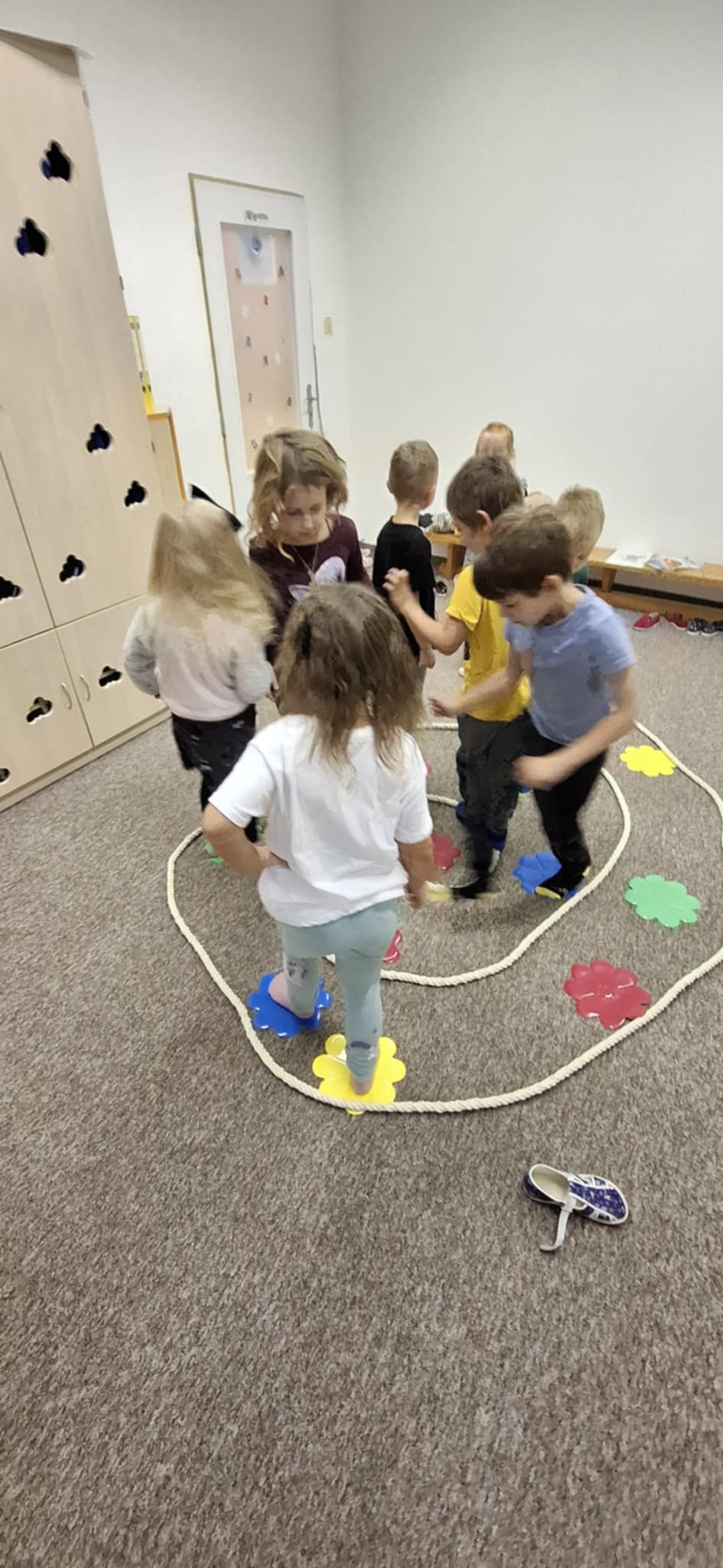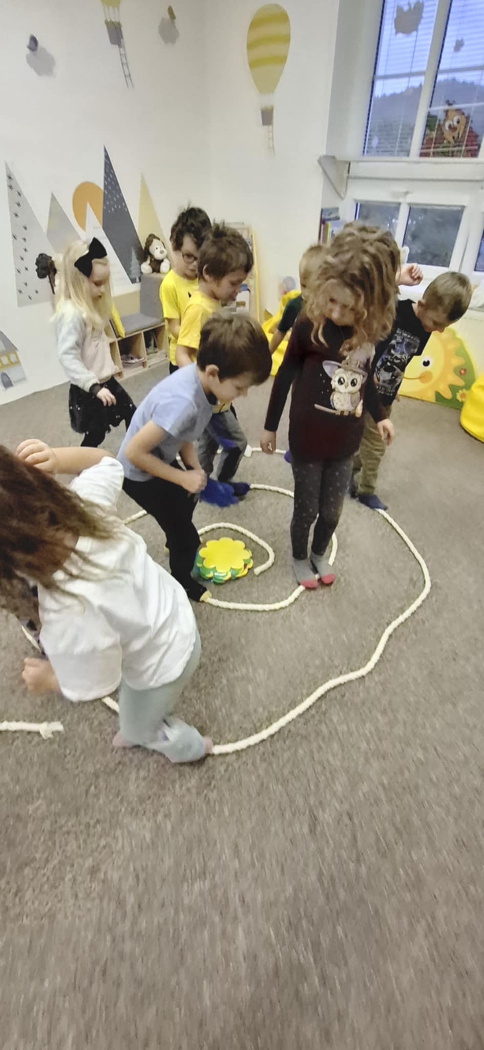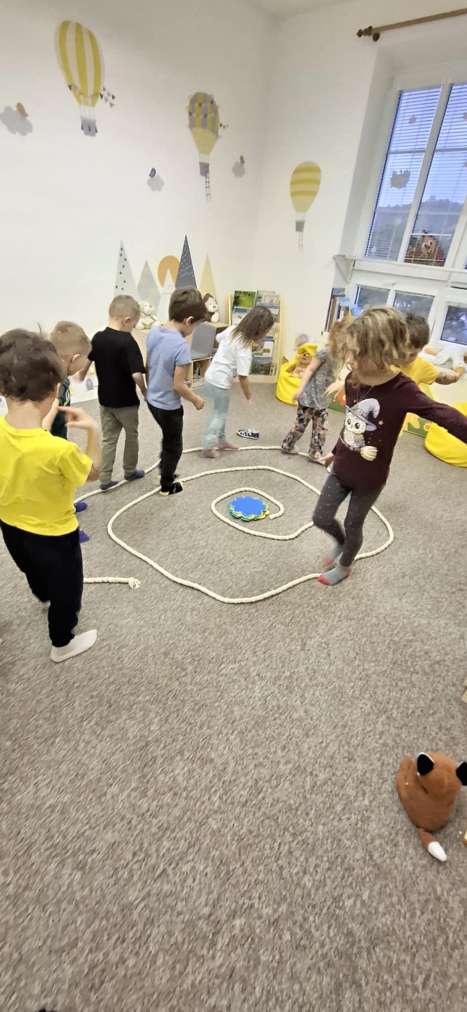 ěti si procvičily pravolevou orientaci a rotaci kolem vlastní osy, chůzí po laně do spirály rozvíjely rovnováhu i prostorovou představivost. Následně podle slovního popisu vyhledávaly odpovídající obrázky a společně určovaly příčinu a následek jednotlivých dějů – rozvíjely tak logické myšlení, pozornost a schopnost soustředění.