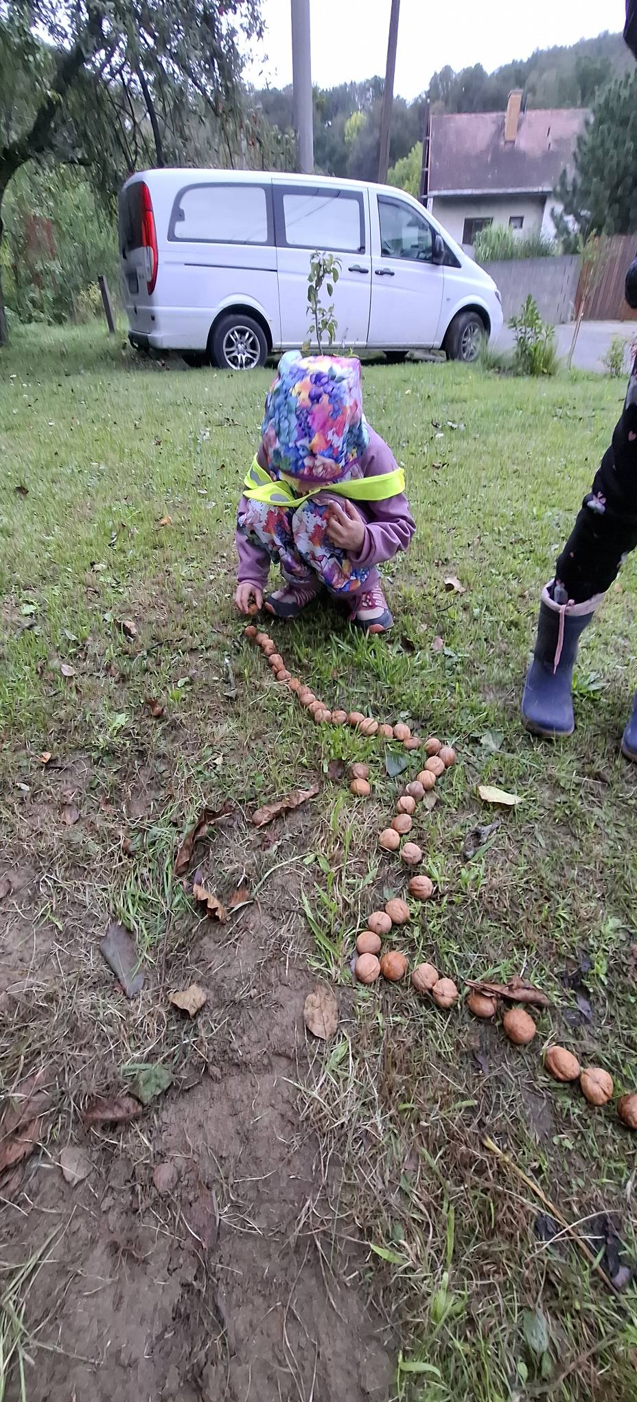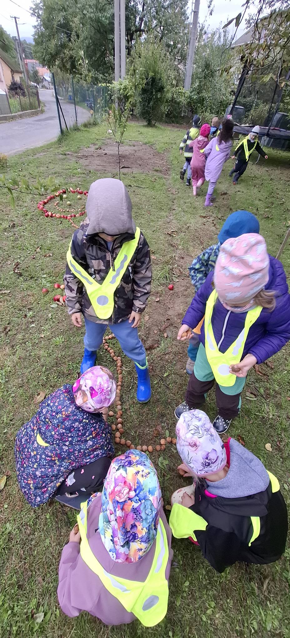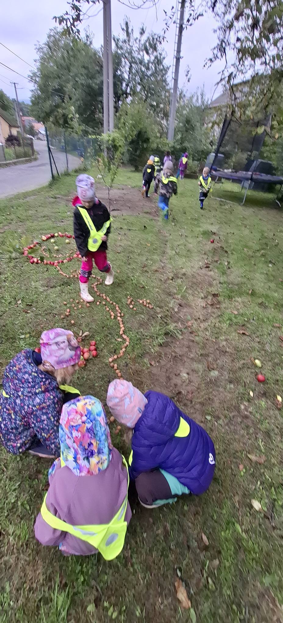 Dnešní den jsme strávili venku – poznávali jsme stromy, sbírali jejich plody a učili se, co roste kolem nás. V rámci spolupráce děti společně vytvořily krásného podzimního draka ze sesbíraných pokladů přírody.