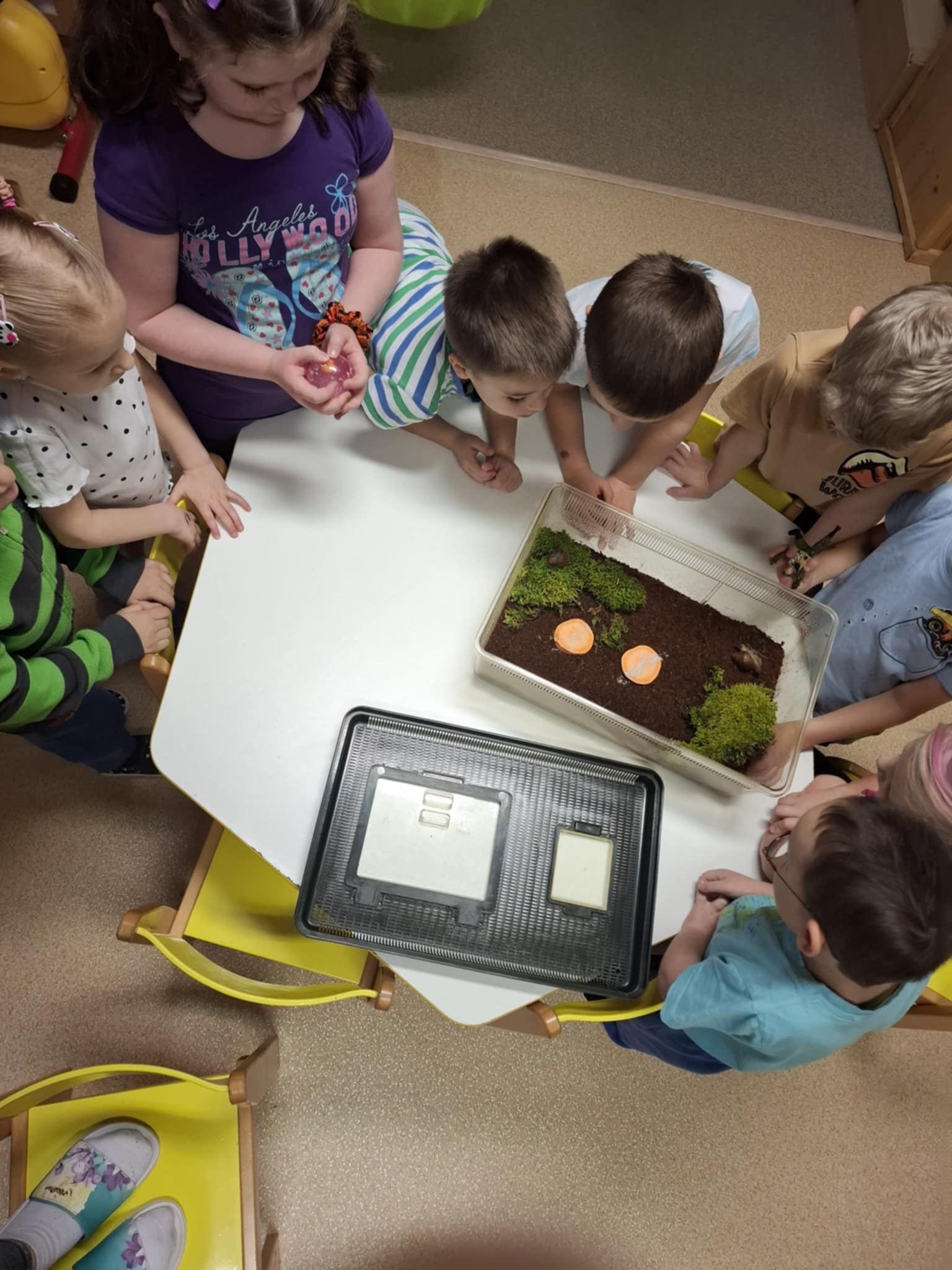 V lednu jsme do mateřské školy přivítaly dva zvířecí kamarády. Šnečí holčičku Julinku a šnečího chlapečka Jindřiška. Děti ze třídy Koťátek vymyslely pro ně tyhle překrásná jména. Děti se o své kamarády budou starat a zkoumat šnečí život přímo ze třídy. Na jaře s nimi budeme trávit čas venku. Šnečí kamarádi mají trvalé bydliště v akváriu umístěném na okně s výhledem na celé naše městečko J Jindřišek se dětem hned ukázal, ale Julinka je šnečí dáma, která se nám ještě stydí J , ale „všechno má svůj čas, až si bude slečna jistá, tak se nám jistě ukáže…“